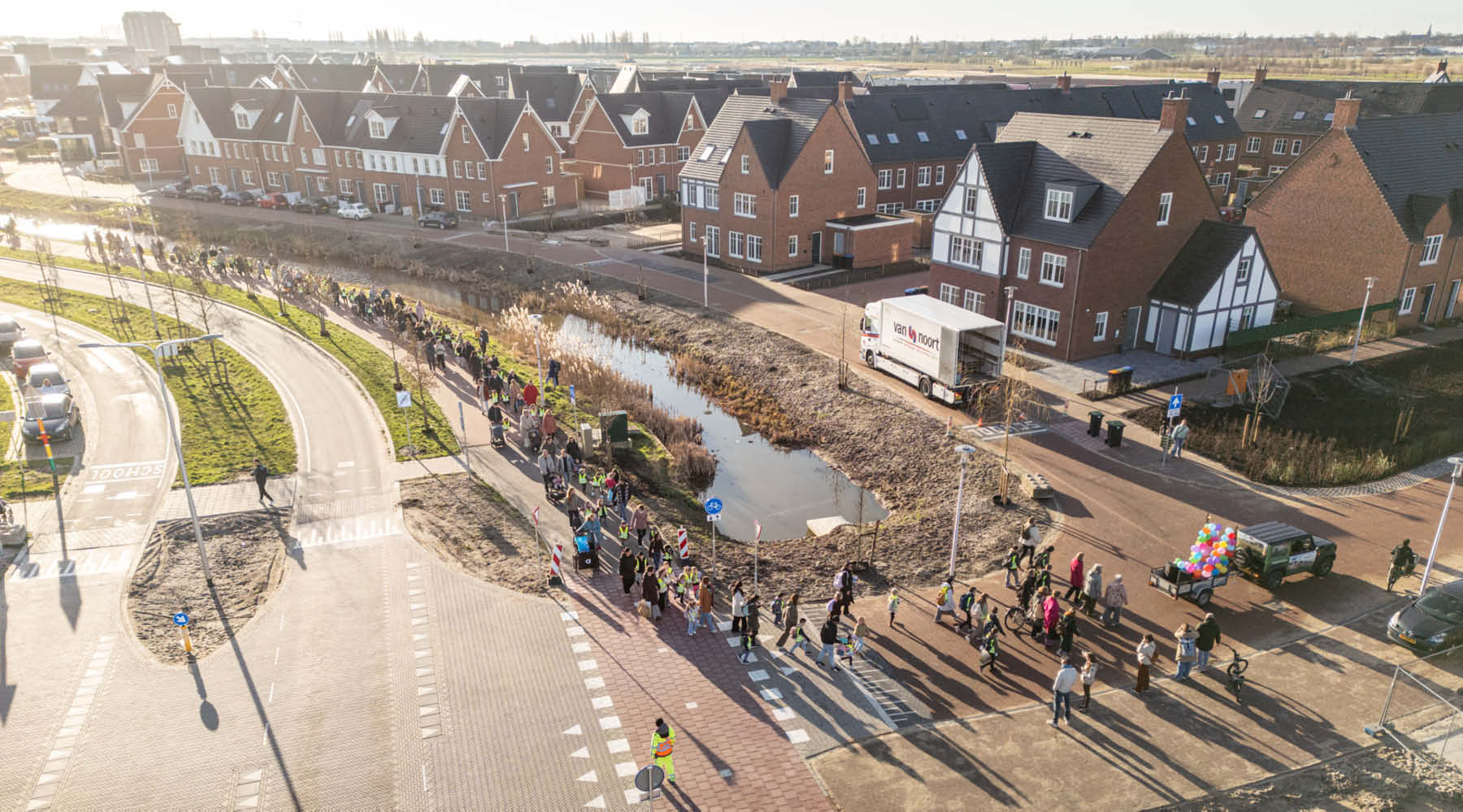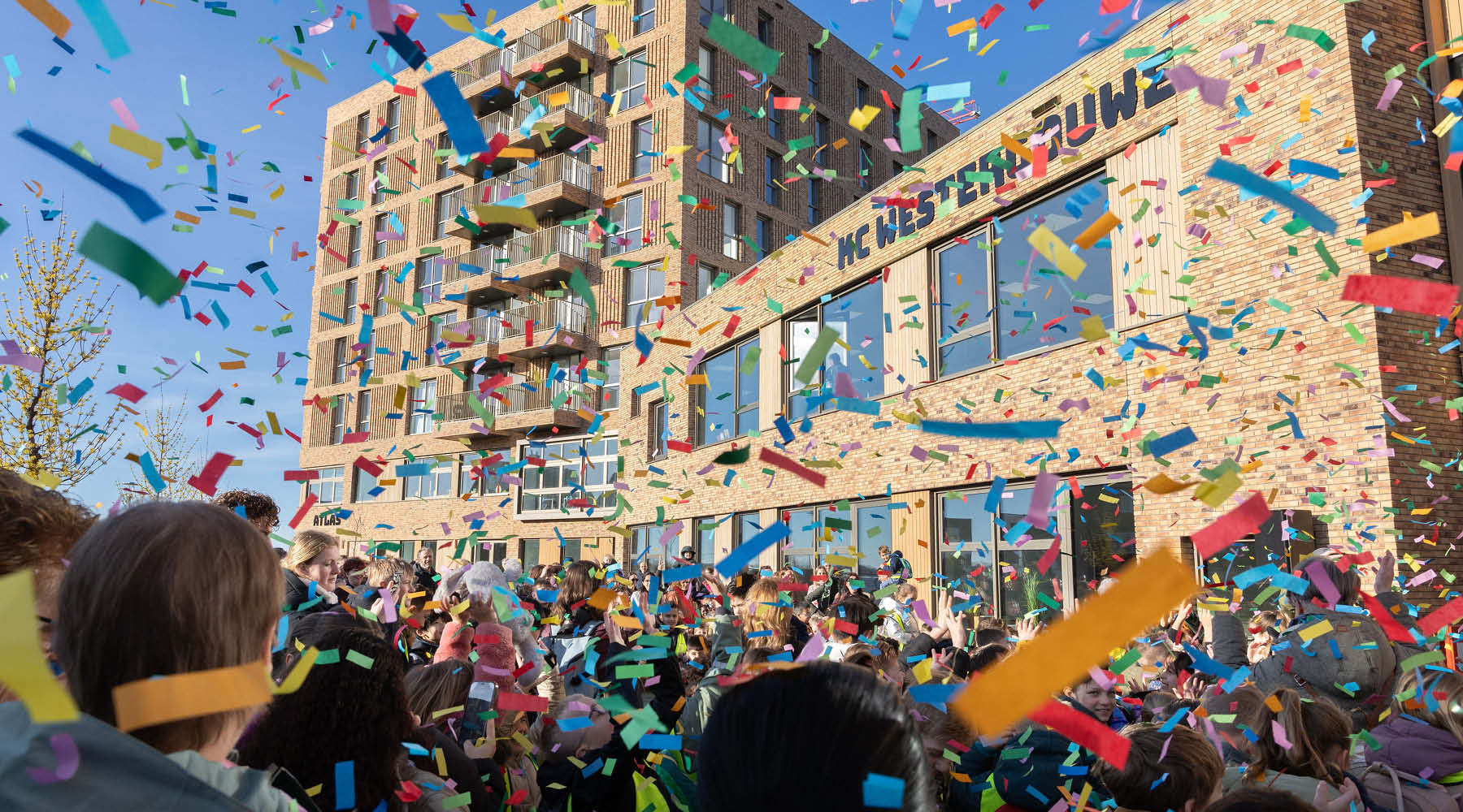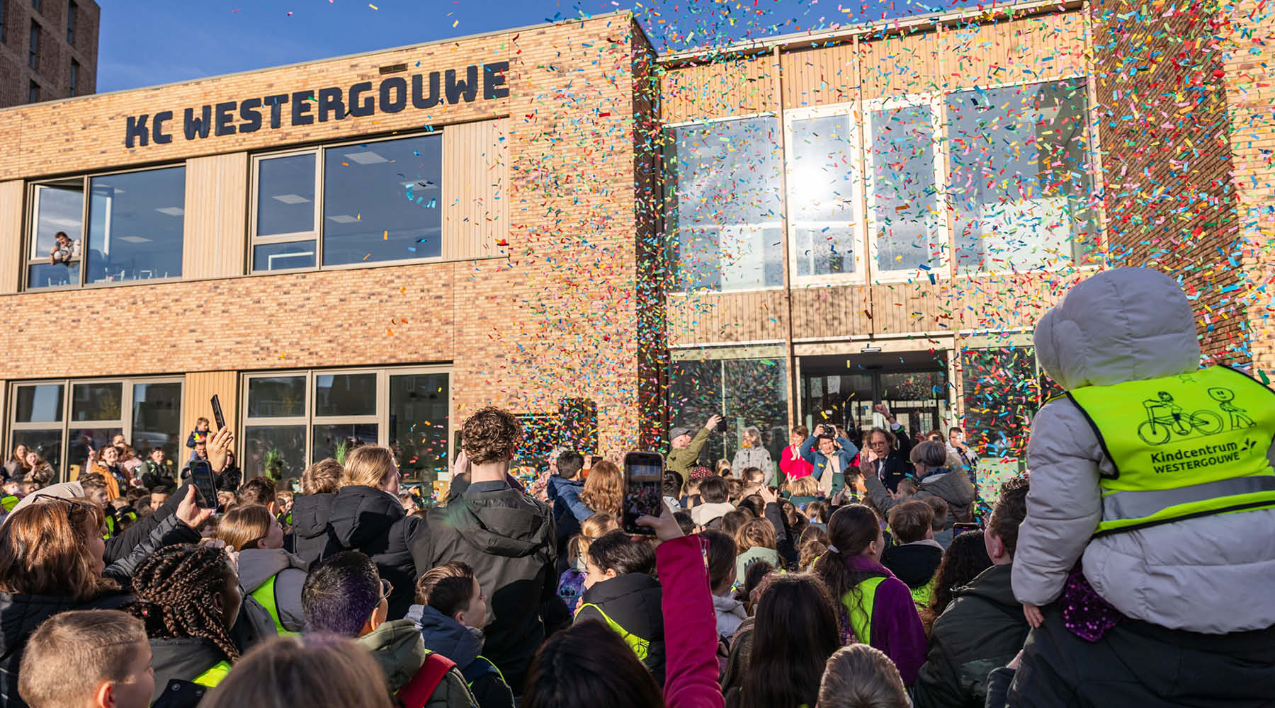 Met een kleurrijke optocht door de wijk is op maandag 2 maart het nieuwe Kindcentrum Westergouwe officieel in gebruik genomen. Zo’n 400 kinderen van basisschool De Ontdekkingsreizigers (vergezeld door een groot aantal ouders) liepen van de huidige basisschool naar het nieuwe kindcentrum om samen deze bijzondere mijlpaal te vieren.