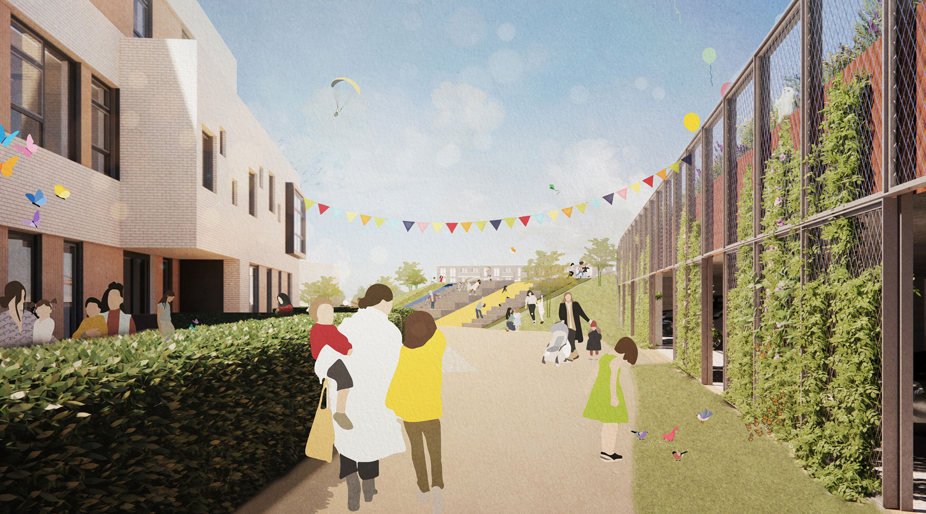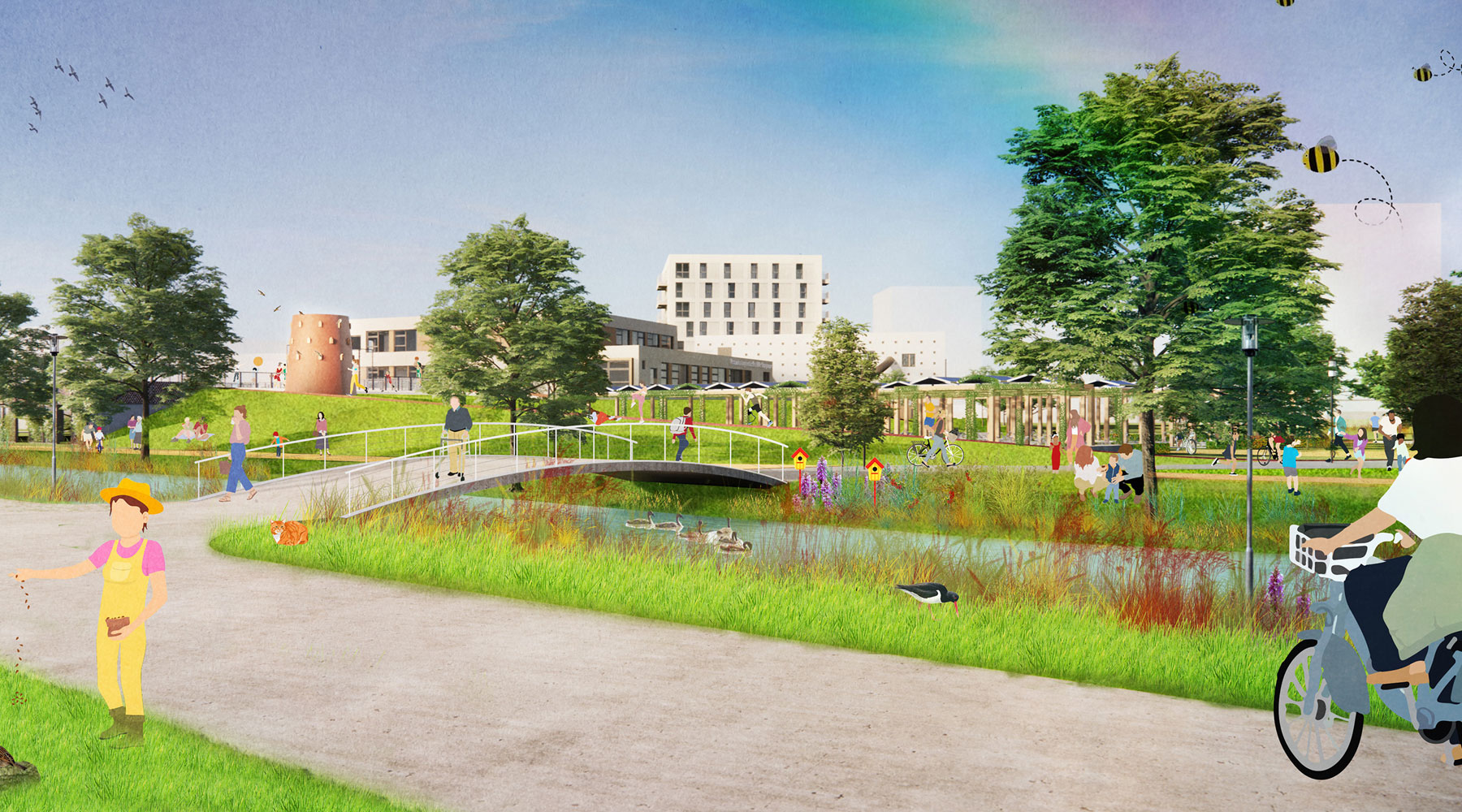 Om het gebouw komt een oeverpark waar buitenspelen, recreëren, sporten, gezond bewegen en ontmoeten actief samenkomen. Het wordt een groene en duurzame plek met activiteiten voor iedereen in de wijk.